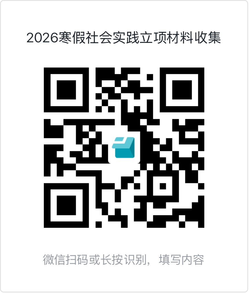 1.自主申报:1月9日下午17:00前,各团队负责人扫描下方二维码,通过问卷提交《项目申报书》(附件2)、《人员信息统计表》(附件3)、全体实践队员的《安全承诺书》(附件5)、指导老师的《安全承诺书》(附件6)、《家长知情同意书》(附件7)。提交材料时,请将所有人员的《安全承诺书》《家长知情同意书》分别放置于一个文件夹,并按汇总表顺序排序。