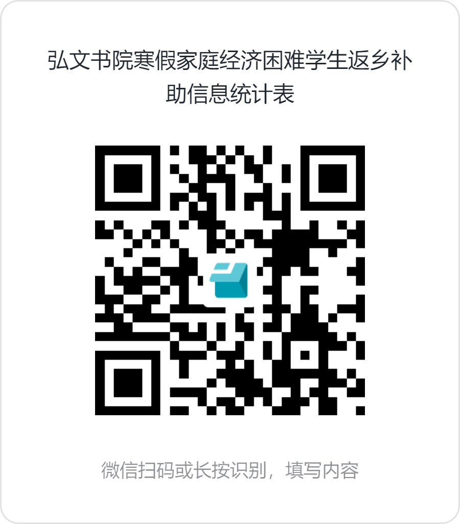 请符合申请条件的同学妥善保存返乡交通票据或订票记录,将相关纸质票据提交至弘文书院A108陈雅琳老师处,并扫码填写《弘文书院寒假家庭经济困难学生返乡补助信息统计表》(票据起始地点原则上应为珠海市,如有特殊情况请在表单备注栏说明,存在特殊困难的学生提交书面情况说明)。纸质版材料须与提交表单的电子材料一致。